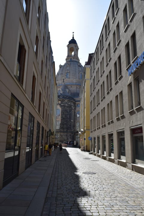 AußenansichtDas Hotel ist rechts zu sehen. Es ist nur wenige Meter von der Frauenkirche entfernt.