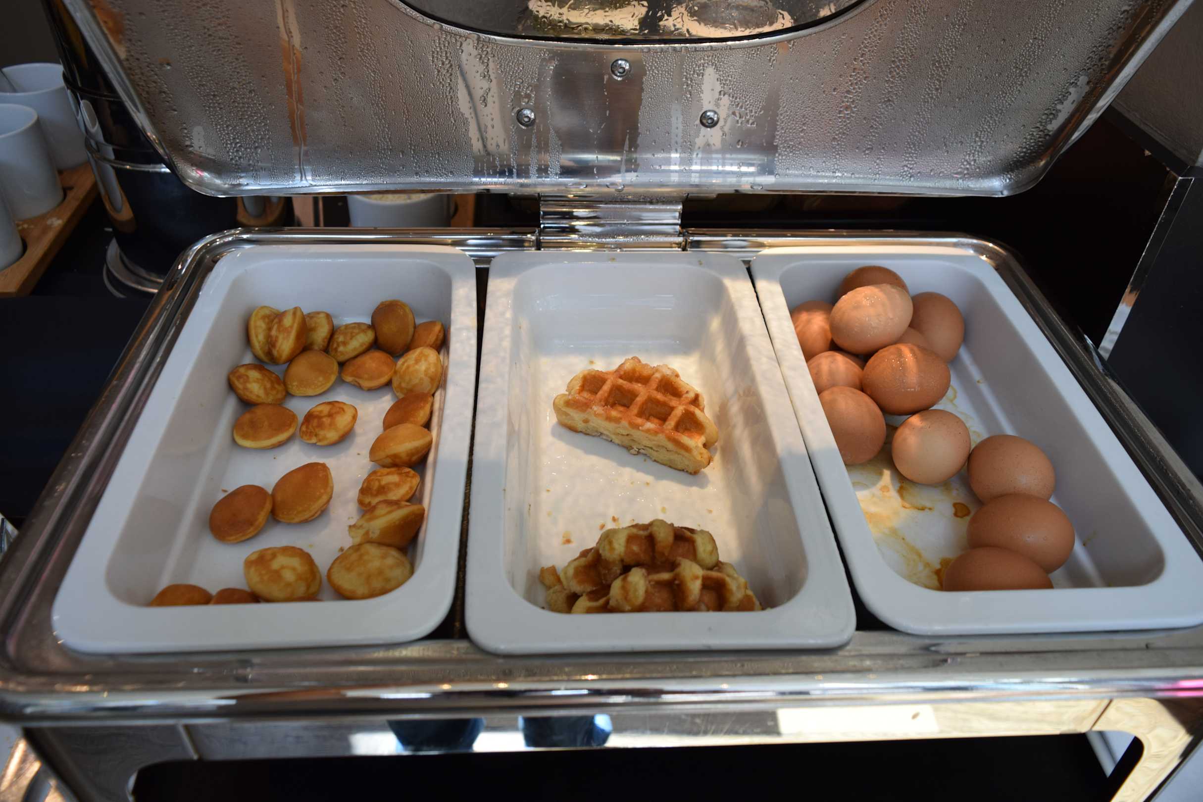 Frühstücksbuffet. Waffeln und hartgekochte Eier.