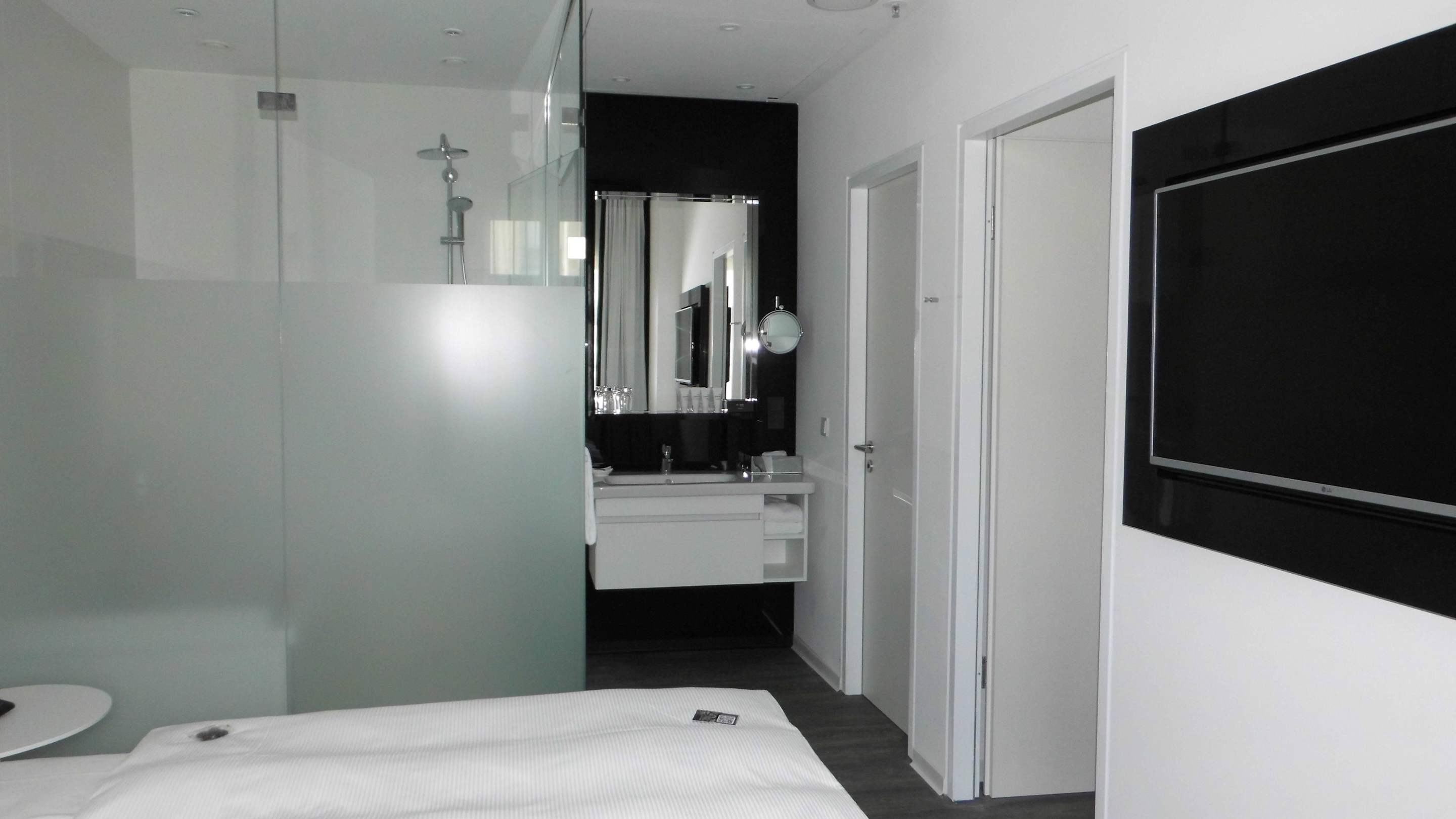 Blick vom Bett zum Waschtisch/Bad