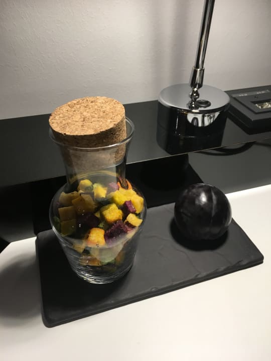 Getrocknetes Gemüse zum Knabbern und eine große Pflaume zur Begrüßung auf dem Zimmer