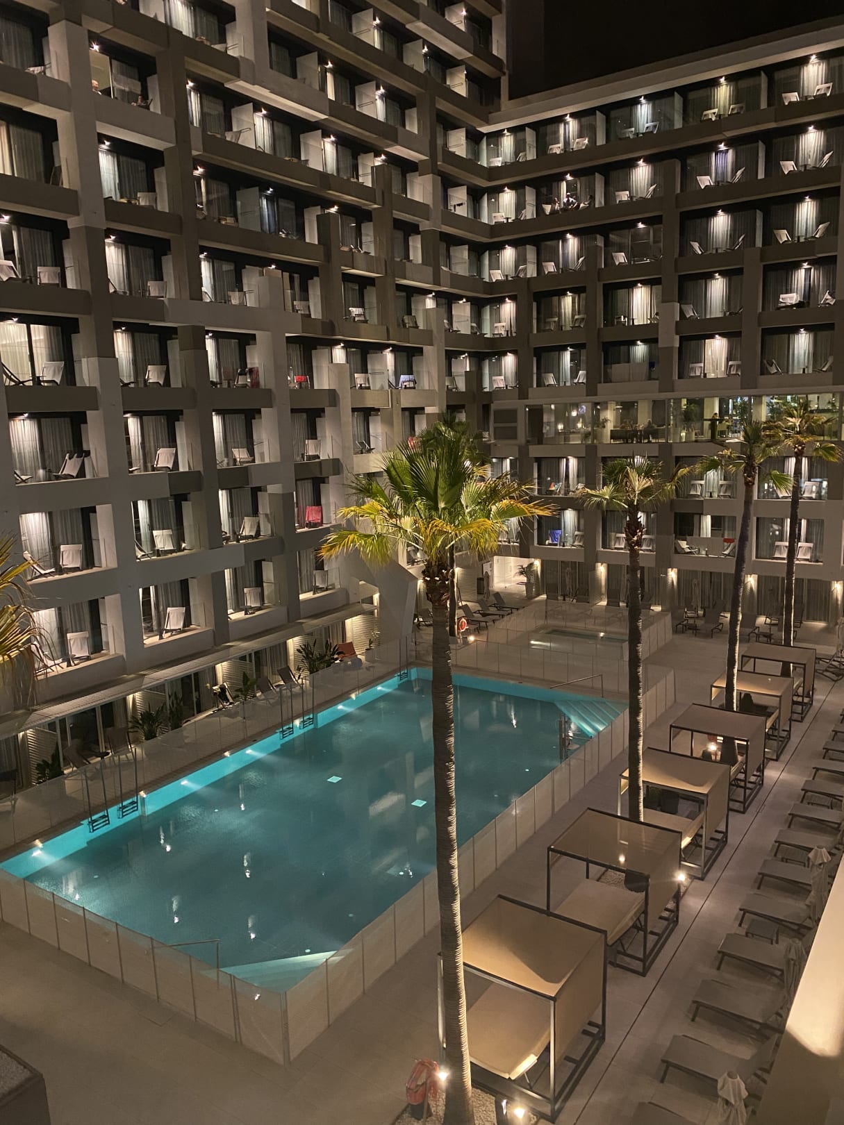 PoolInnenseite des Hotels von der Bar aus fotografiert mit Blick auf den Pool und die umliegenden Zimmer mit Balkon.