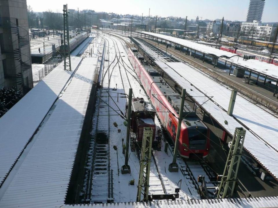 Blick aus Fenster von Zi 334Vor der Hauswand enden die S-Bahn Linien. Die Fenster sind aber ein ausreichender Schallschutz im Winter, wenn man diese zulassen kann. Im Sommer stelle ich mir den Lärm von der Bahn nicht erträglich vor. Zumindest, wenn man das Fenster beim Schlafen geöffnet lassen will.