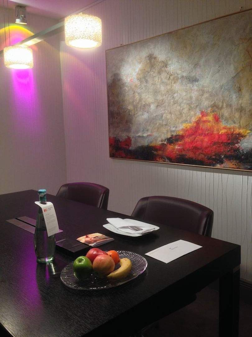 Großer Ess-/KonferenztischIn den Senior-Suiten des Westflügels gibt es neben Sofa, Schreibtisch etc. einen schönen einladenden Tisch, an dem sich wunderbar essen, besprechen und arbeiten lässt. Hier zu sehen mit den IHG Treatments (Obstkorb, Wasser, Schokolade etc.)