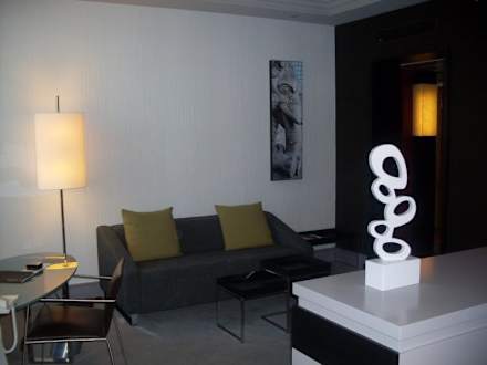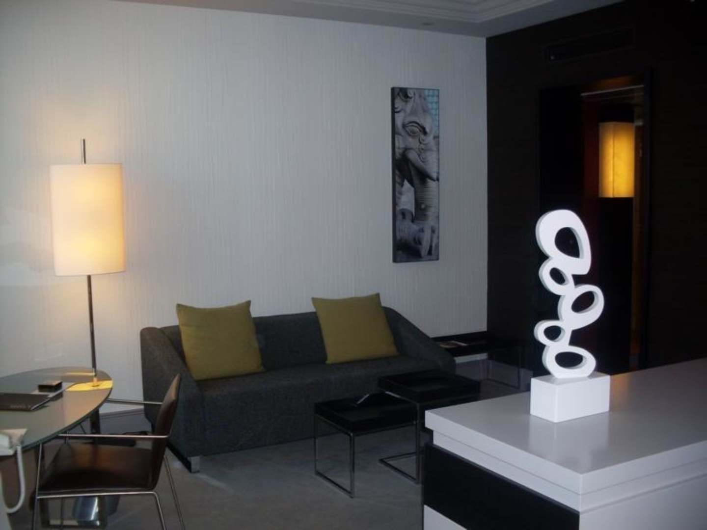 Blick zur CouchLinks Schreibtisch und TV, hinten Sofa und rechts Minibar-Schrank mit stilisierter Blume.