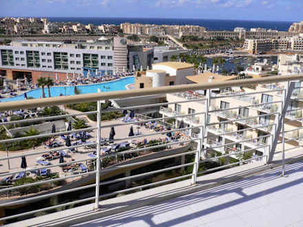 Ausblick vom obersten (15.) Stockwerk..... auf den Pool, hinten links: Einkaufszentrum und hinten rechts: Wasser