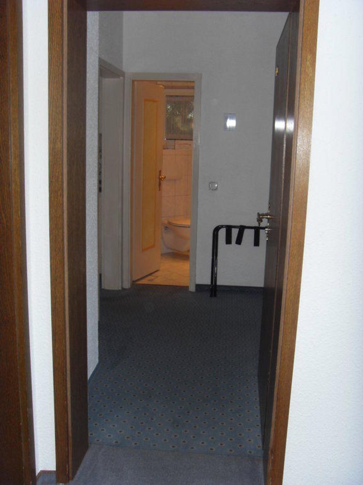 Fotografiert von der Zimmertür aus, in den Flur. Geradeaus ist das Badezimmer, links gehts in den Wohnbereich mit Schrank, Küche und Schlafzimmer