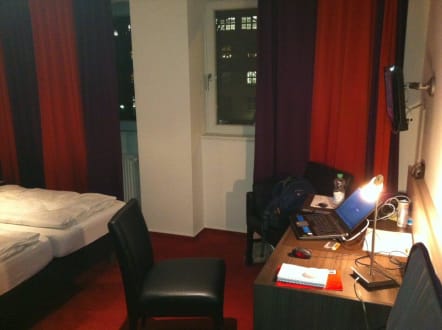 Bett, Schreibtisch, Kofferablage, Blick zur Straße