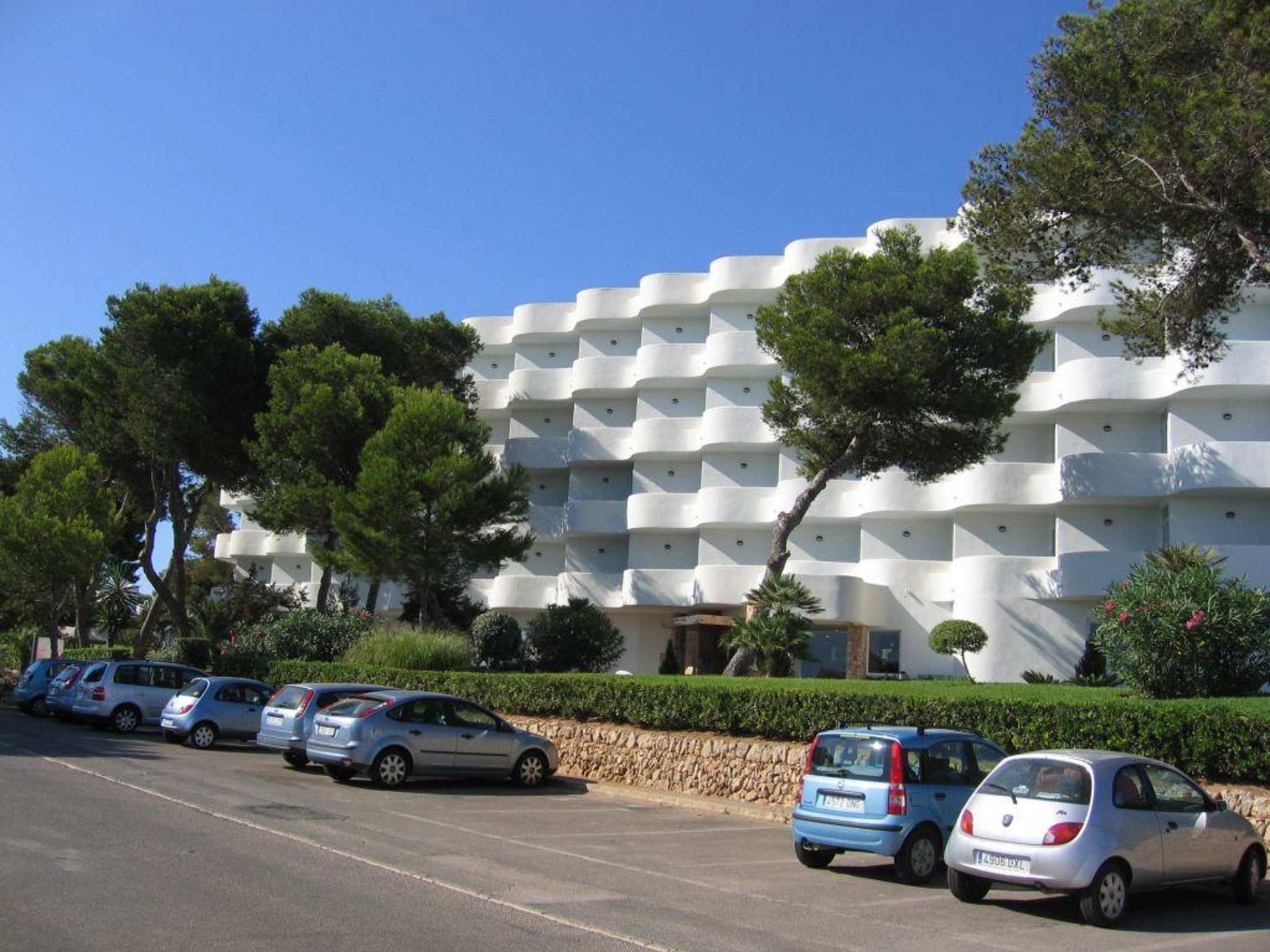 Aussenansicht des Hotels mit einem Teilausschnitt der Parkplätze