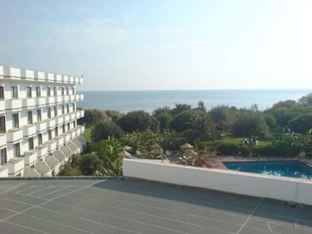 Blick aus einem anderen Gebäudeteil über das Restaurantdach (Vordergrund) auf Pool, Garten und Meer