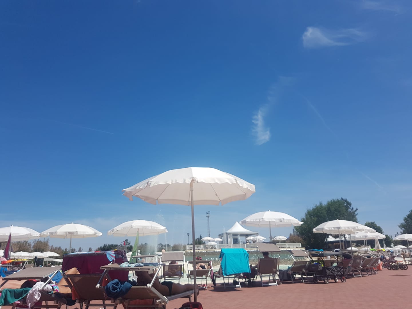Um die Pools herum im Freibad stehen viele Liegen und Schirme. Im Eck standen sogar nocht einige gestapelte Liegen. Man konnte sich da eine wegnehmen, wenn alle anderen belegt waren.