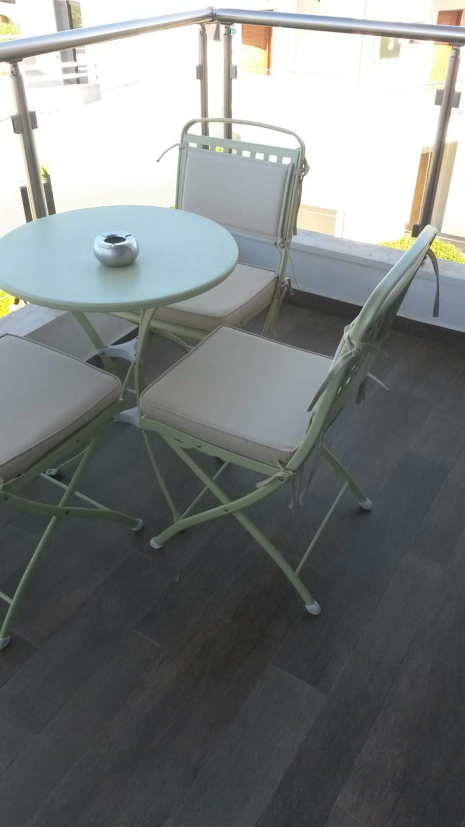 Balkon mit Tisch und Stühlen. Blickrichtung Meer.