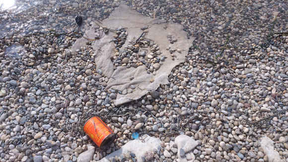 Kiesstrand am Eingang... rostige Dosen, Unrat
