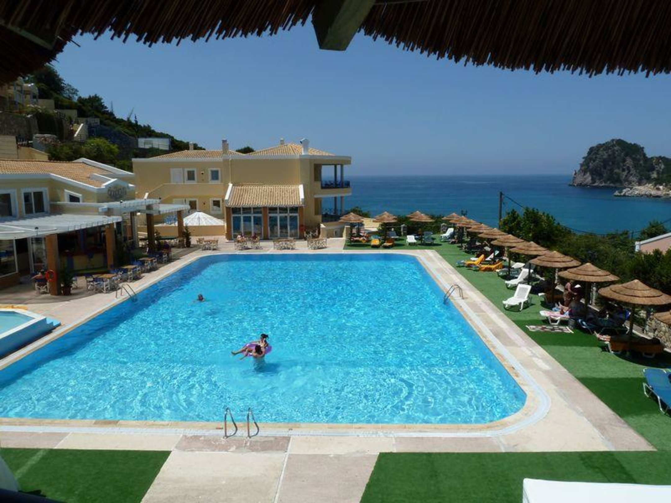 rechts Liegen und Sonnenschirme. links Poolbar