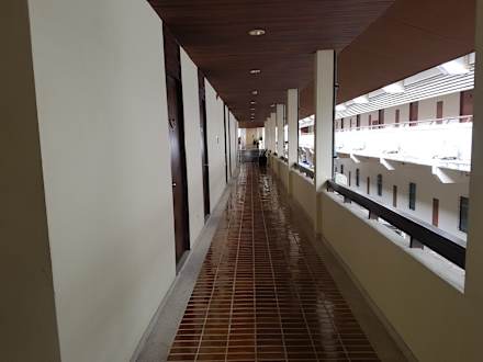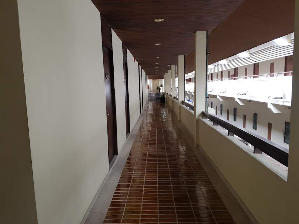 Haupthaus Gang im ersten OG zu den Zimmern - rechts ist die Nachbar-Hotel-Anlage, die Zimmer haben hinten Ausblick auf die Outlet-Plaza / Main Street