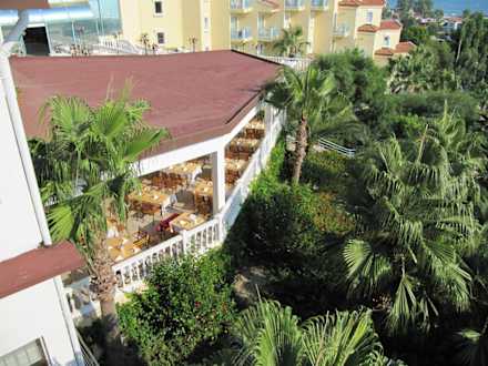 Blick in den Garten & auf die Restaurantterrasse