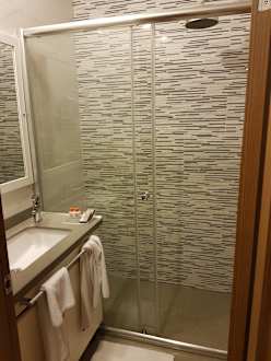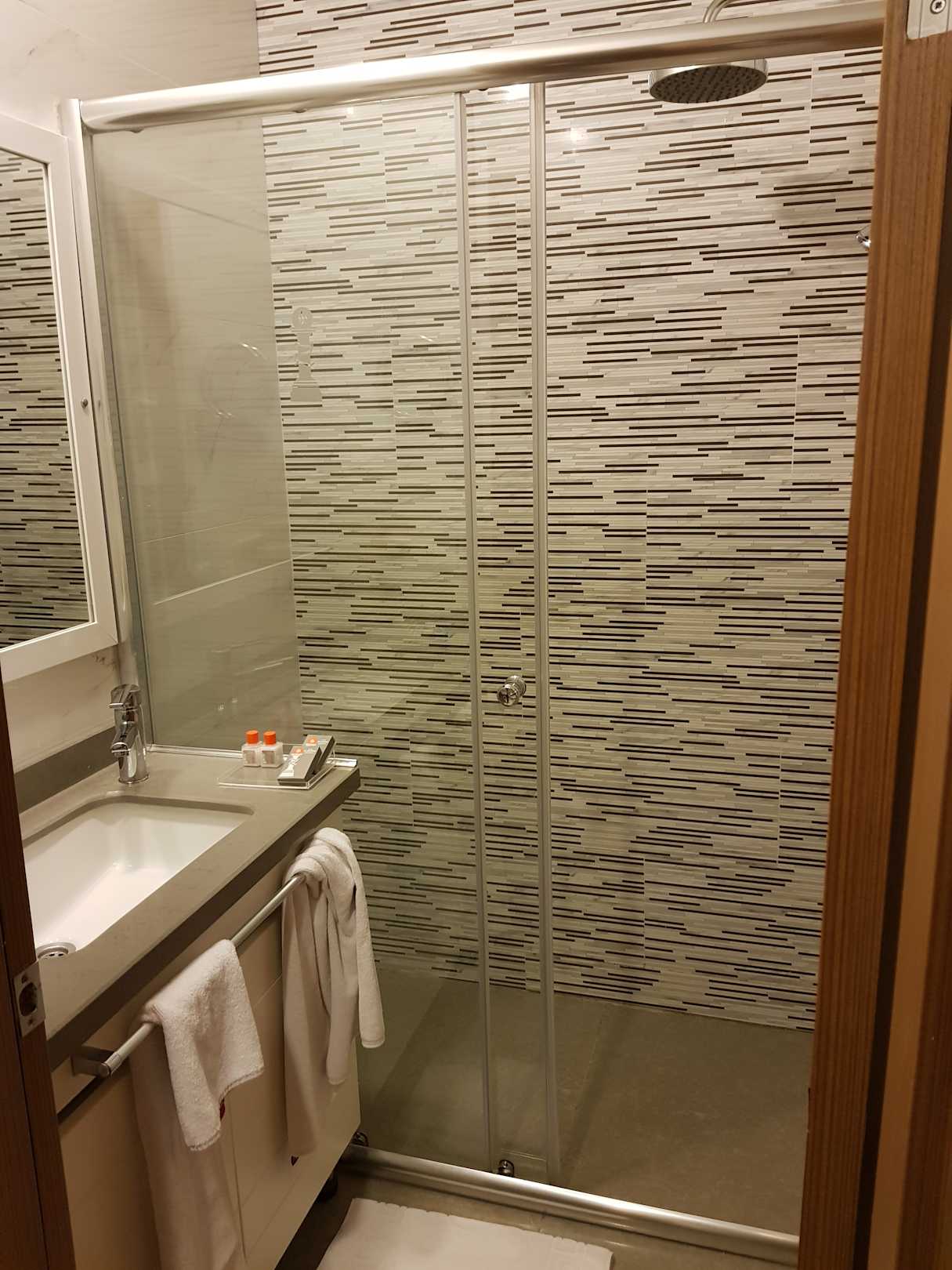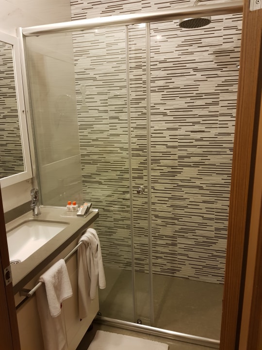 Badezimmer. Die Tür ist in der Raummitte, geht nach innen auf und reicht bis an die Dusche. Man muss sich also um die Tür rumquetschen, wenn man auf die Toilette möchte!