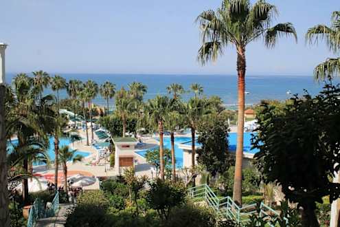 Blick von der Terrasse auf die Pools