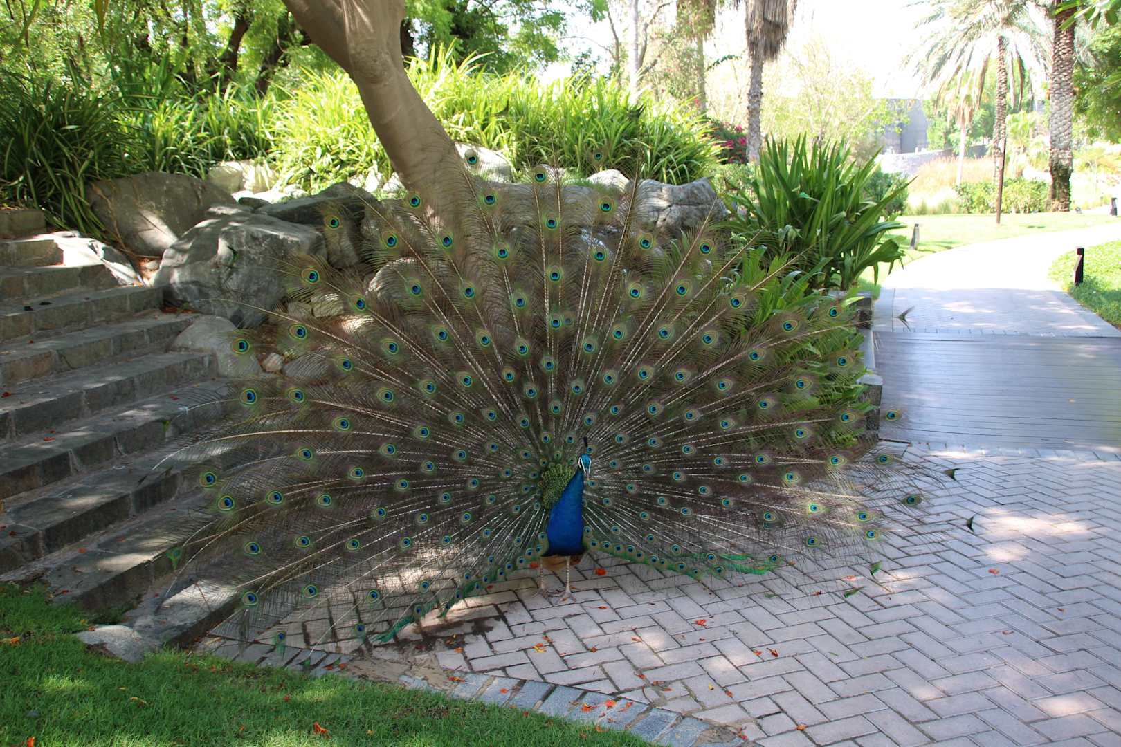 Freilaufender Pfau im Garten