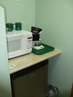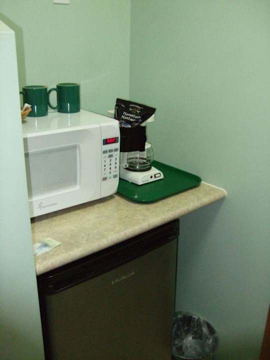 Mikrowelle, Kaffeemaschine und Kühlschrank im Zimmer