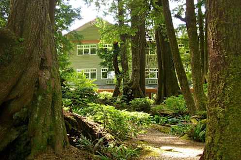 Rückansicht der Lodge vom Wald aus