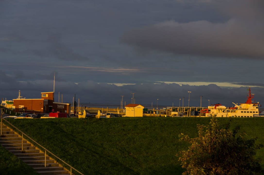 Blick auf den Fährhafen bei Soonenuntergang