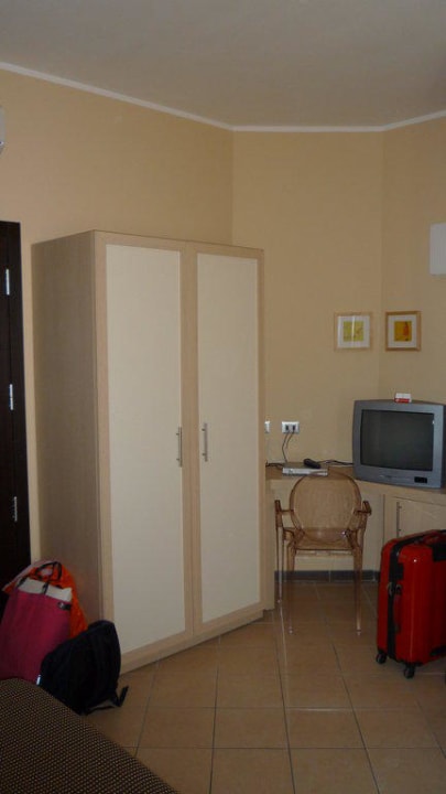 Blick auf den Kleiderschrank und den Fernseher. Unter dem Fernseher ist der Kühlschrank.