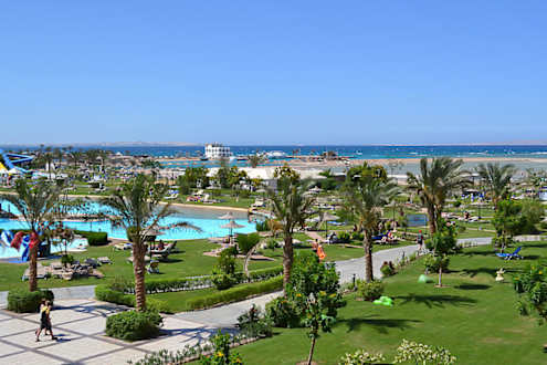 Sehr gepflegtdazwischen die sehr schön gestalteten Pools und hinten links die großen Rutschen - alles ständig kontrolliert und gesäubert.