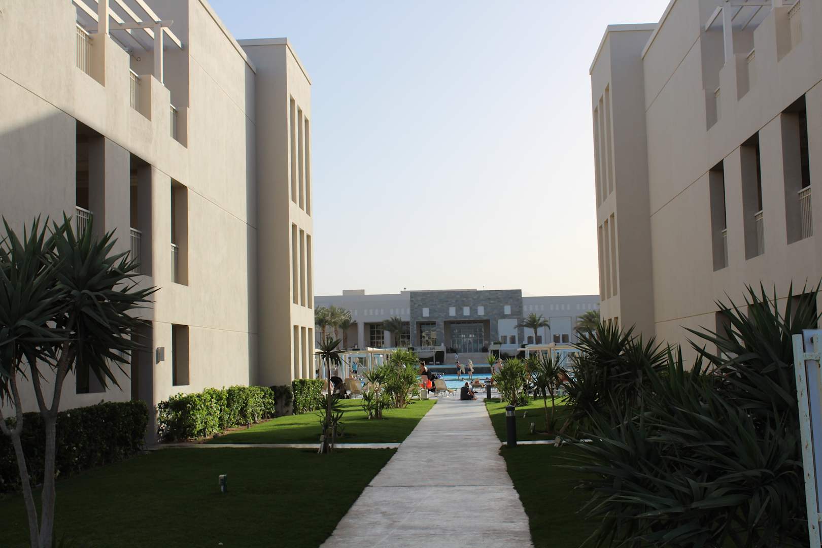 Blick von der Rückseite zum Haupthaus über die Poolanlage