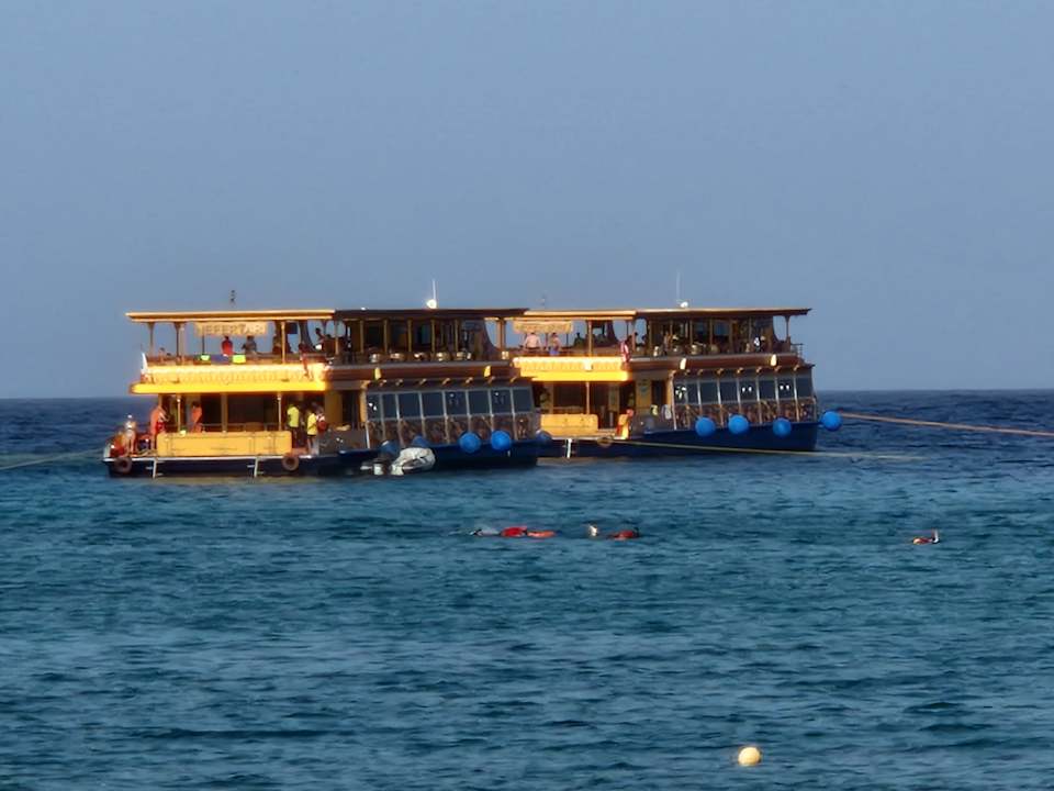AusblickGastschiffe in der Bucht mit Schnorchlern auf der Suche nach der Seekuh