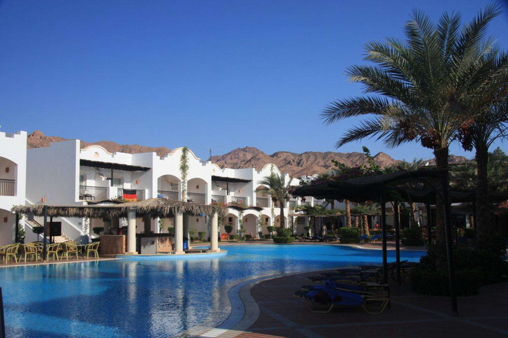 Pool mit Gebäudereihe 2 und Gebirge im Hintergrund