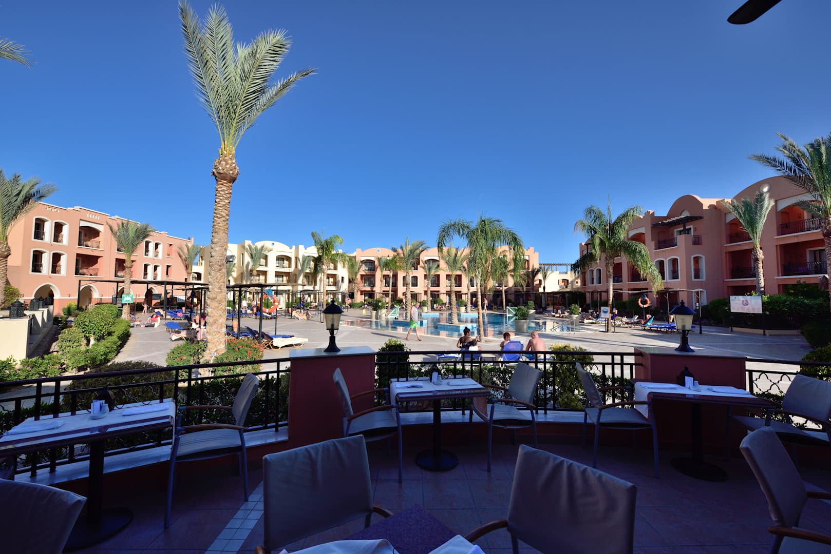 Von Terrasse auf Pool u. Hotelzimmer