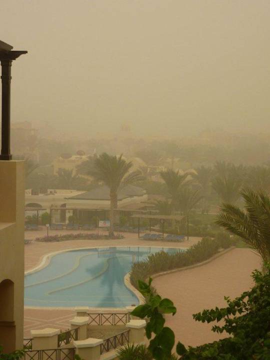 Blick auf die Hotelanlage während des Sandsturmes