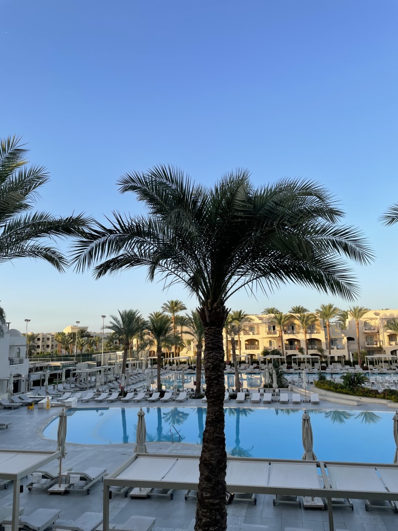 Ausblick vom Zimmer auf den Pool.