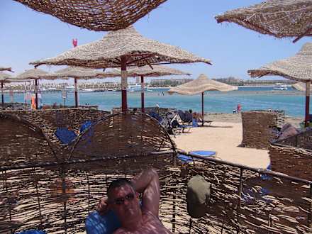 Strand mit Liegen,Schirmen und Windschutz