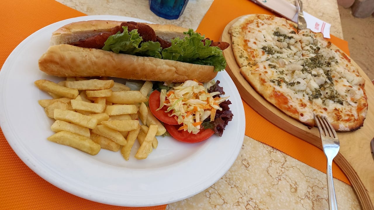 GastroMittags an der Strandbar: Meeresfrüchte-Pizza, Shicken-Baquett mit Pommes und Beilage. Sehr lecker.