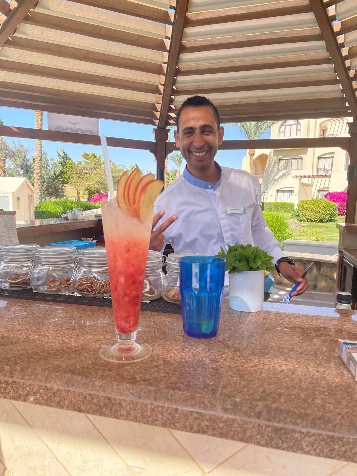 Mahmoud „best Barkeeper ever“…. verwöhnt die Gäste am Relax Pool mit seinen Drinks Kreationen, mit und ohne Alkohol… an diesem Pool, keine Animation, keine Musik, keine Kinder, Ruhe pur, mit Bibliothek