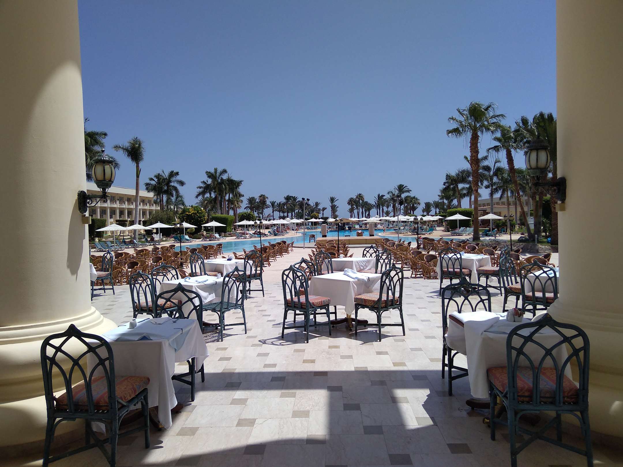 Blick vom Hauptrestaurant über Poolbereich zum Strand