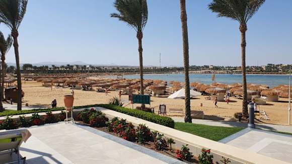 Lagune mit Hotelstrand.