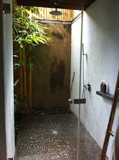 AußenduscheHervorragendes Konzept! Grosszügiges Bad mit Ankleide drinnen, Dusche draussen. Alles total geschmackvoll!