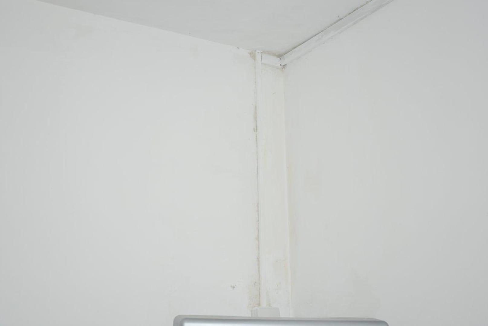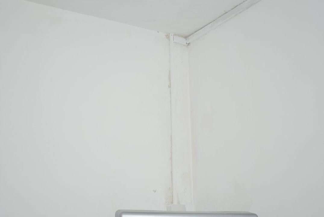 Die Ecke im Zimmerauch hier sind nasse Stellen an der Wand, die durch frische Wandfarbe ersetzt wurden, zu sehen - Schimmelgeruch