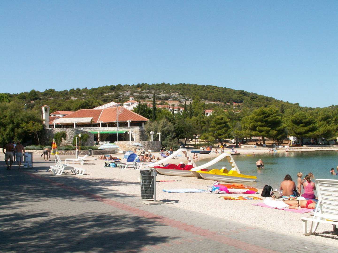 Plaża, dalej restauracja, w głębi apartamenty