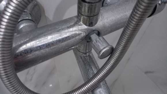 An der Armatur in der Dusche sind die Spuren der Gäste über Jahre fleißig gesammelt worden.