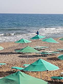 So einen schlechten Strand habe ich noch nicht gesehen. Steine , Kies, man kann nicht ohne Badeschuhe ins Wasser, Sonnenschirme und Liegen verschmutzt und kaputt.