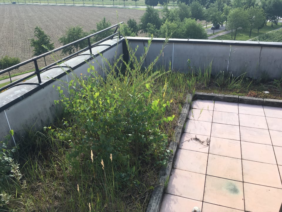 AußenansichtDas Dachgeschoss wirkt gefährlich. Nägel stehen heraus und es wirkt baufällig. Unkraut sprießt.