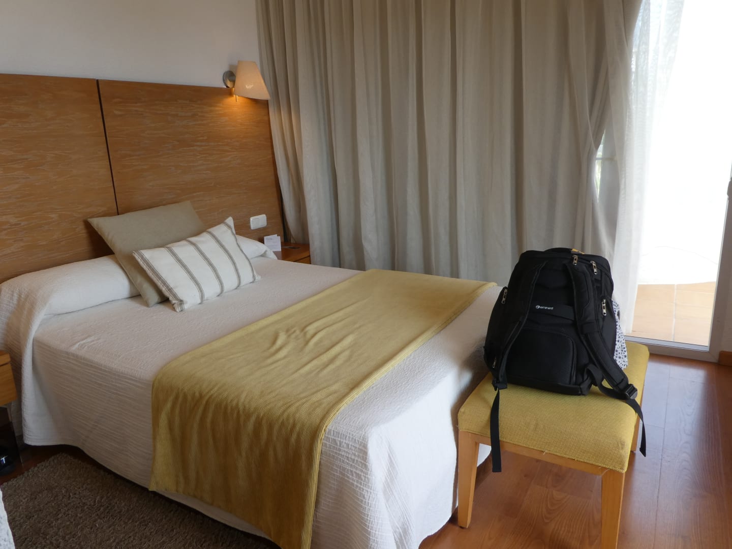 Einzelzimmer: Bett, Nachttisch, Hocker, Kühlschrank, TV, Kleiderschrank, Ganzkörperspiegel