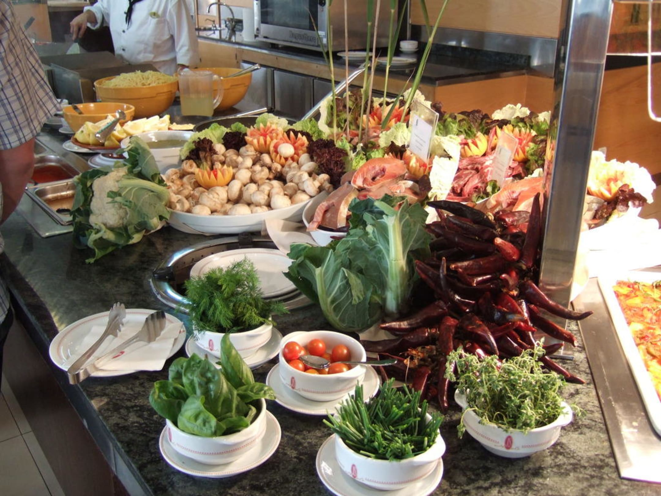 Teil des Buffets, dass die Speisen zeigt, die laufend frisch gebraten werden
