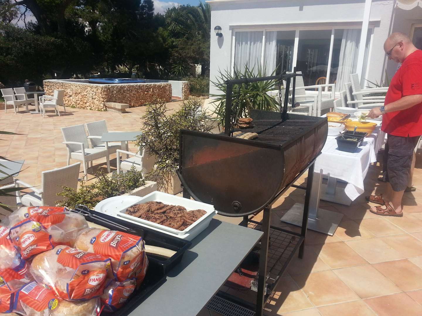Burger und Hot Dogs auf dem Grill, Mittags.