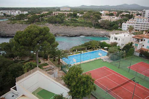 Hotelanlage vom 6. Stock aus betrachtet mit Tennisplätzen und Schwimmpool