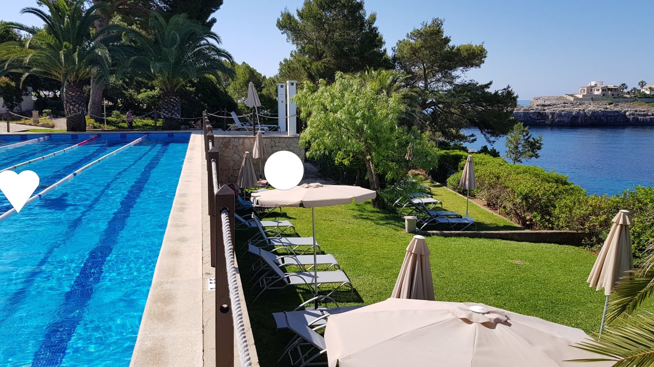Blick auf Pool und ein Sück der Gartenanlage