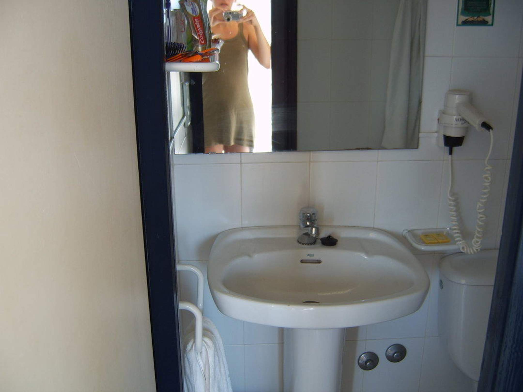 neben dem Waschbecken befindet sich eine Ablage, die mit zwei frischen Zahnputzbechern ausgerüstet ist. Zudem hat jedes Zimmer einen Fön, der aber nur funktioniert, wenn vorher das Licht im Bad angemacht wurde.